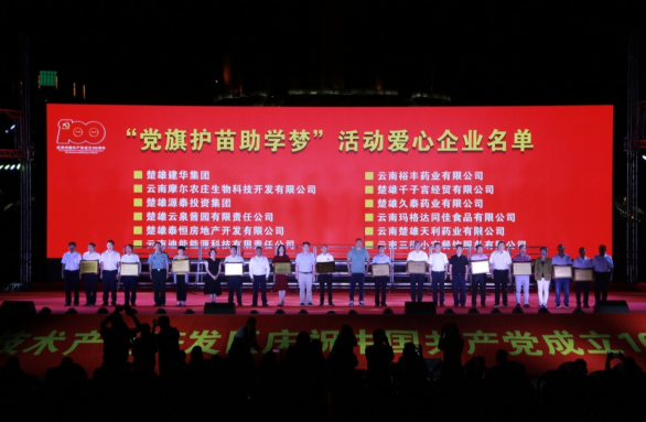 晚会期间,楚雄高新区还对“党旗护苗助学梦”公益活动捐资助学的建华集团、摩尔农庄、源泰集团等12户爱心企业授予牌匾,以表彰企业帮扶学子圆学梦作出的贡献。
